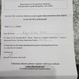 Devdoot Donor Rajiv (O-) 30th times at Appollo Sartia Vihar hospital for 91yrs patient in emergency for surgery..
